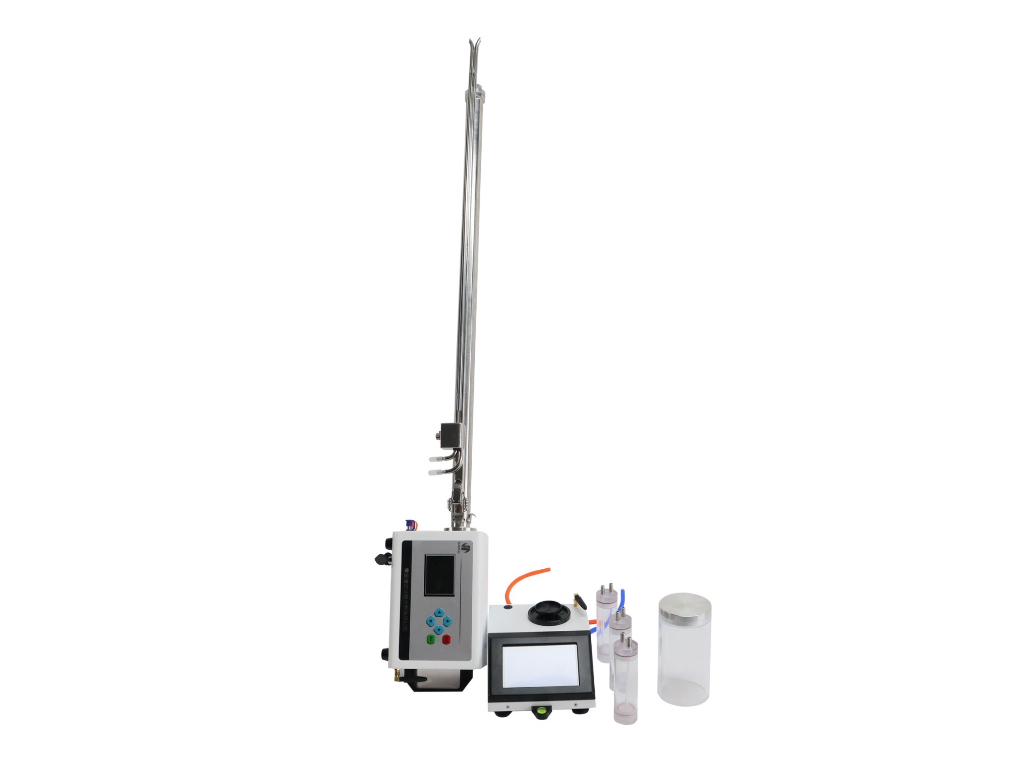 三、JH-6062B型重量法含湿量测试仪性能特点 ◆ 主机采用 5.0 寸高亮彩色触摸显示屏,良好人机交互界面,中文菜单显示,图文并茂,方便操作 ◆ 适用于 HJ 836-2017 标准根据采样瓶采样前后的重量差及采样数据自动计算含湿量 ◆ 取样管采用 316 不锈钢,前端加装高效滤芯,有效过滤粉尘,内管加热,防止水汽凝结,提高测量精度 ◆ 主机与取样管之间采用无线传输,称重后无需人工输入参数自动计算含湿量