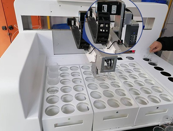 采用发布进口电驱动三轴机器人运动臂,代替人工,批量自动转移样品,实现从待测区至试剂添加区 ——样品消解区——自动滴定区的样品杯转移。