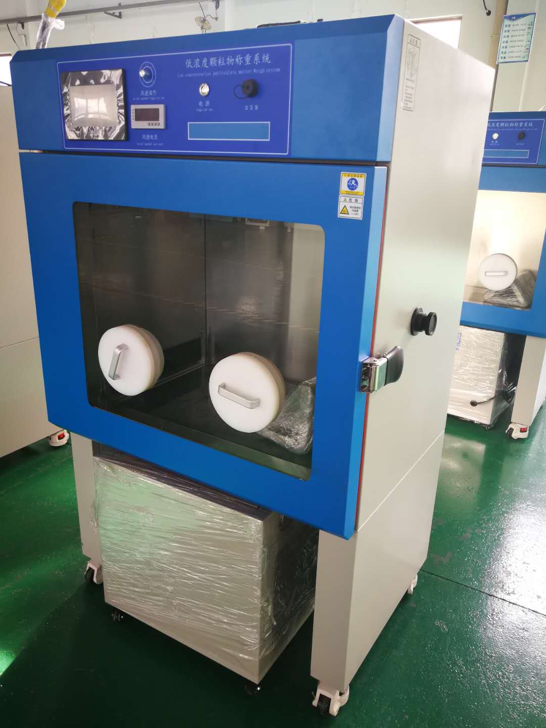 低浓度称量恒温恒湿设备是在恒温恒湿箱内放置电子天平,将要称量的样品在恒温恒湿箱内的平衡区进行 24 小时平衡后进行手动称量。本产品解决了实验室环境温度湿度的变化对样品称重结果的影响,极大提高了称量结果的准确性。